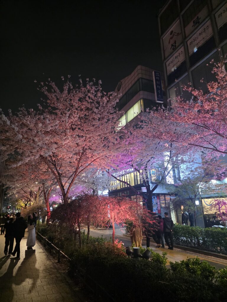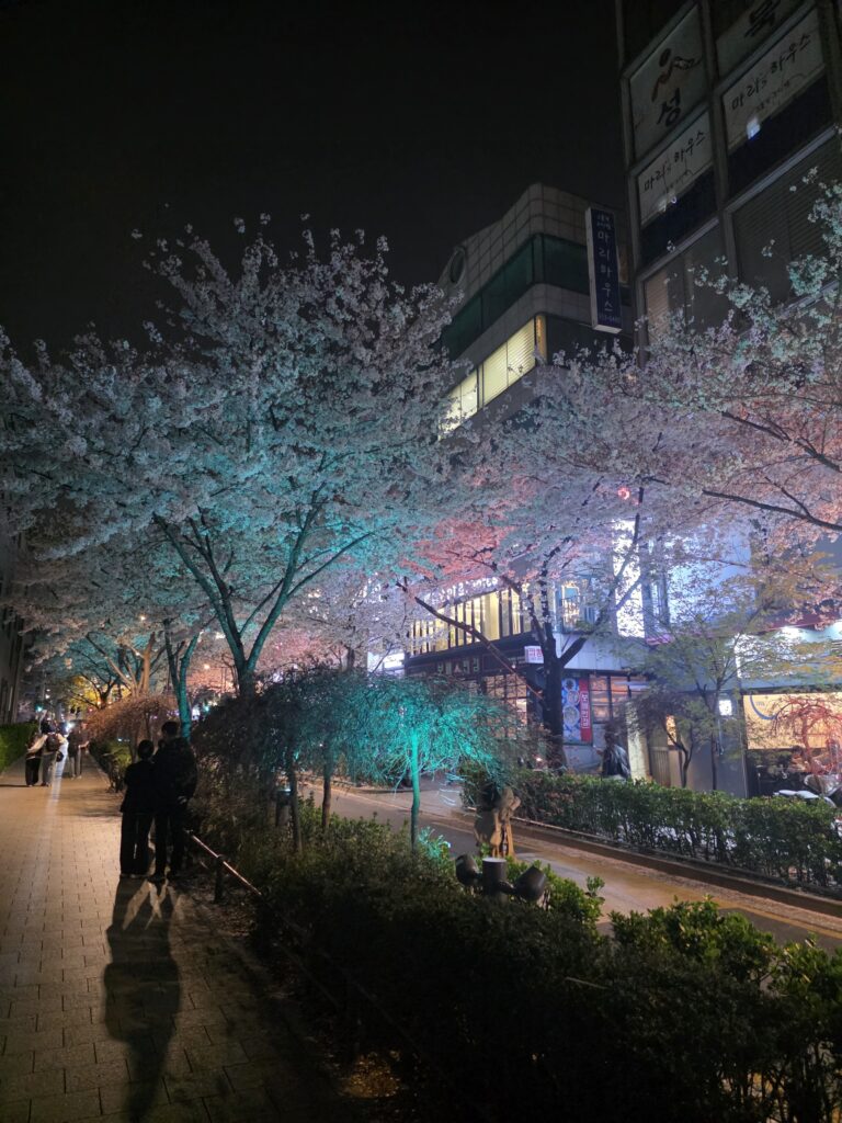 The street is lined with mature yoshino cherry trees whose branches form a natural canopy over the pedestrian walkway. After dark, colored uplights at the base of each tree wash the blossoms in rotating hues β deep violet, electric teal, warm salmon pink. One section glows entirely in purple, the white petals taking on a bruised, luminous quality. Another stretch is lit in teal that makes the flowers look almost underwater. The overall effect is genuinely cinematic, and unlike anything I’ve seen at Seoul’s more famous blossom spots.